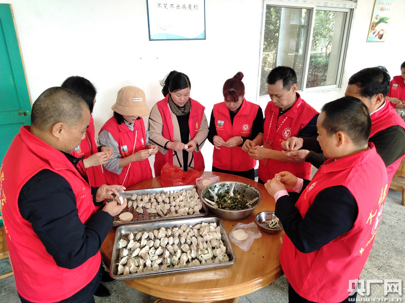 在受災(zāi)鄉(xiāng)鎮(zhèn)九堡鎮(zhèn),志愿者一到活動地點敬老院,就忙碌開來,有的在挑選配料韭菜,有的在切帶來的豬肉,還有的在貼喜慶的對聯(lián)。隨后,志愿者們再次合作,嫻熟地包著一個又一個餃子。餃子雖小,情意濃濃。