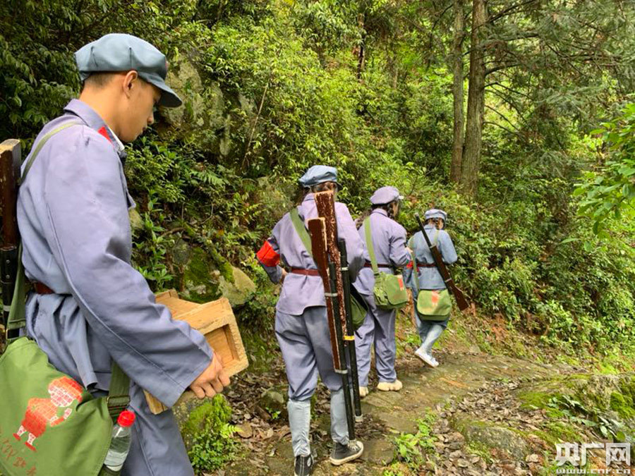 在茅坪鄉(xiāng)壩上村茂密的竹林中,我遇上了一支身著紅軍服,肩扛彈藥箱的行軍隊伍,村民告訴我,這不是拍電影電視,而是全國青少年井岡山革命傳統(tǒng)教育基地在他們壩上村開展的體驗教學(xué)課程——“紅軍的一天”。