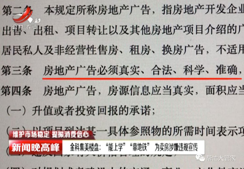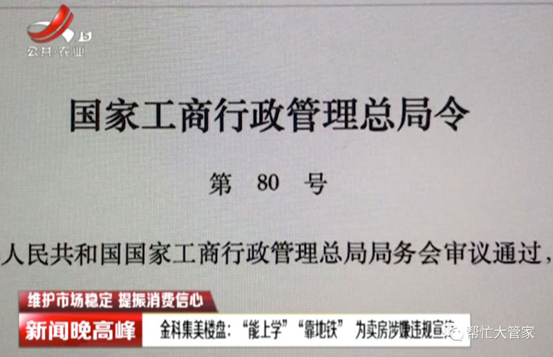 2016年2月1日起,國(guó)家工商總局實(shí)施了《房地產(chǎn)廣告發(fā)布規(guī)定》。其中明確規(guī)定了,房地產(chǎn)廣告必須真實(shí)、合法、科學(xué)、準(zhǔn)確、不得欺騙、誤導(dǎo)消費(fèi)者,“傍名!薄ⅰ芭彽罔F”、“最好”、“買到就是賺到”等詞語(yǔ)都不能用,而金科集美陽(yáng)光樓盤的宣傳中,則用了“5號(hào)地鐵沿線”這樣的詞語(yǔ)。