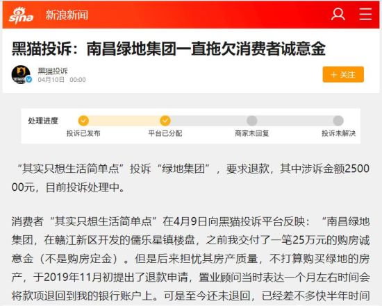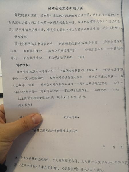 市民投訴贛江新區(qū)綠地“違規(guī)收取誠(chéng)意金”遲遲不退