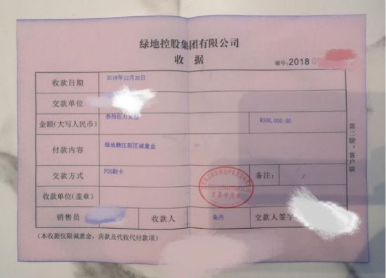 記者注意到,在齊莊提供的“綠地控股集團(tuán)有限公司收據(jù)”上顯示,2018年12月,齊莊通過(guò)POS機(jī)刷卡繳納了35萬(wàn)元,付款人為“董某(齊莊)”董某系綠地置業(yè)顧問(wèn);付款內(nèi)容為“綠地贛江新區(qū)誠(chéng)意金”,收據(jù)上蓋有“江西贛江新區(qū)綠地申銳置業(yè)有限公司”的發(fā)票專用章。