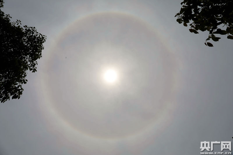 4月24日中午12點40分左右,江西省分宜縣上空出現(xiàn)了難得一見的日暈現(xiàn)象,整個太陽發(fā)出耀眼的白色光團,在白色光團的圍攏下,用肉眼無法看清太陽的輪廓,感覺太陽比平時增大了上百倍,在太陽光團的外圍出現(xiàn)一個環(huán)形彩色光環(huán),猶如彩虹一般,日暈現(xiàn)象持續(xù)了一個多小時后才漸漸消失。