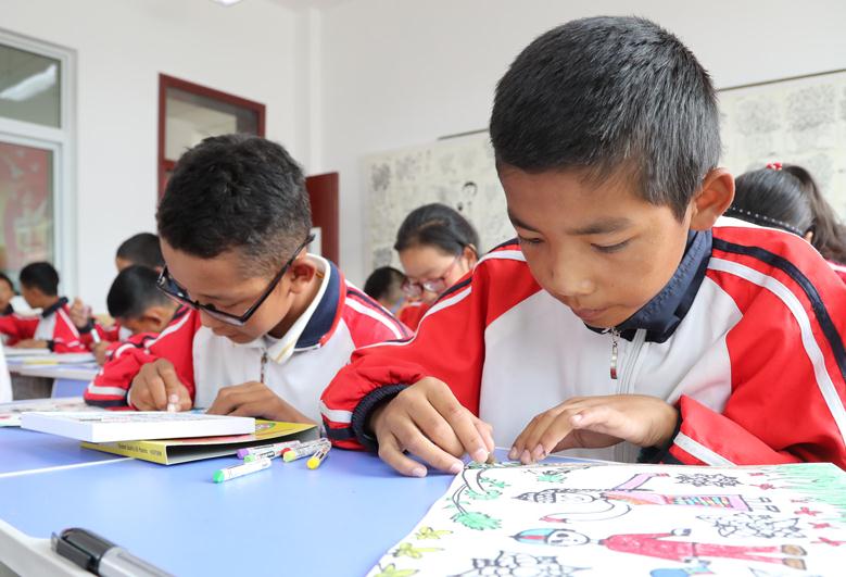 藏區(qū)孩子正在認(rèn)真上繪畫課。(樊世剛/攝)