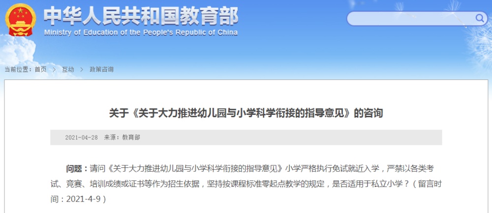 教育部基礎(chǔ)教育司對此回應(yīng)稱,《關(guān)于大力推進(jìn)幼兒園與小學(xué)科學(xué)銜接的指導(dǎo)意見》中的“幼小”包括民辦小學(xué)和幼兒園。2019年,中共中央、國務(wù)院印發(fā)了《關(guān)于深化教育教學(xué)改革全面提高義務(wù)教育質(zhì)量的意見》(中發(fā)〔2019〕26號),強(qiáng)調(diào)“推進(jìn)義務(wù)教育學(xué)校免試就近入學(xué)全覆蓋”“嚴(yán)禁以各類考試、競賽、培訓(xùn)成績或證書等作為招生依據(jù),不得以面試、評測等名義選拔學(xué)生”,這些要求適用于公辦和民辦義務(wù)教育學(xué)校。