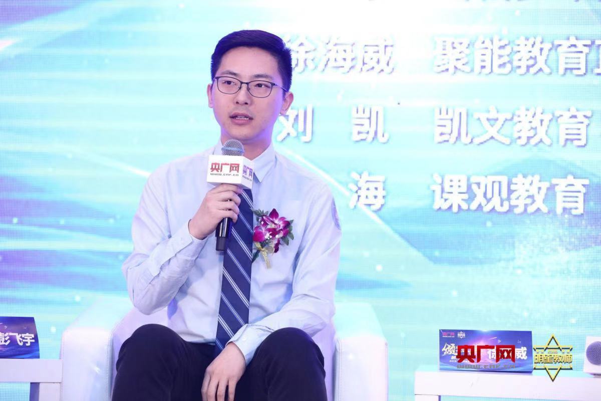 在圓桌論壇環(huán)節(jié)中,中央廣播電視總臺主持人張寶東,當(dāng)代少年副總裁、思維與口才項目總監(jiān)彭飛宇,聚能教育直營事業(yè)部總經(jīng)理徐海威,凱文教育校長劉凱,課觀教育首席講師于海圍繞“新時代背景下教師如何緊跟時代發(fā)展”話題進行了深入討論。