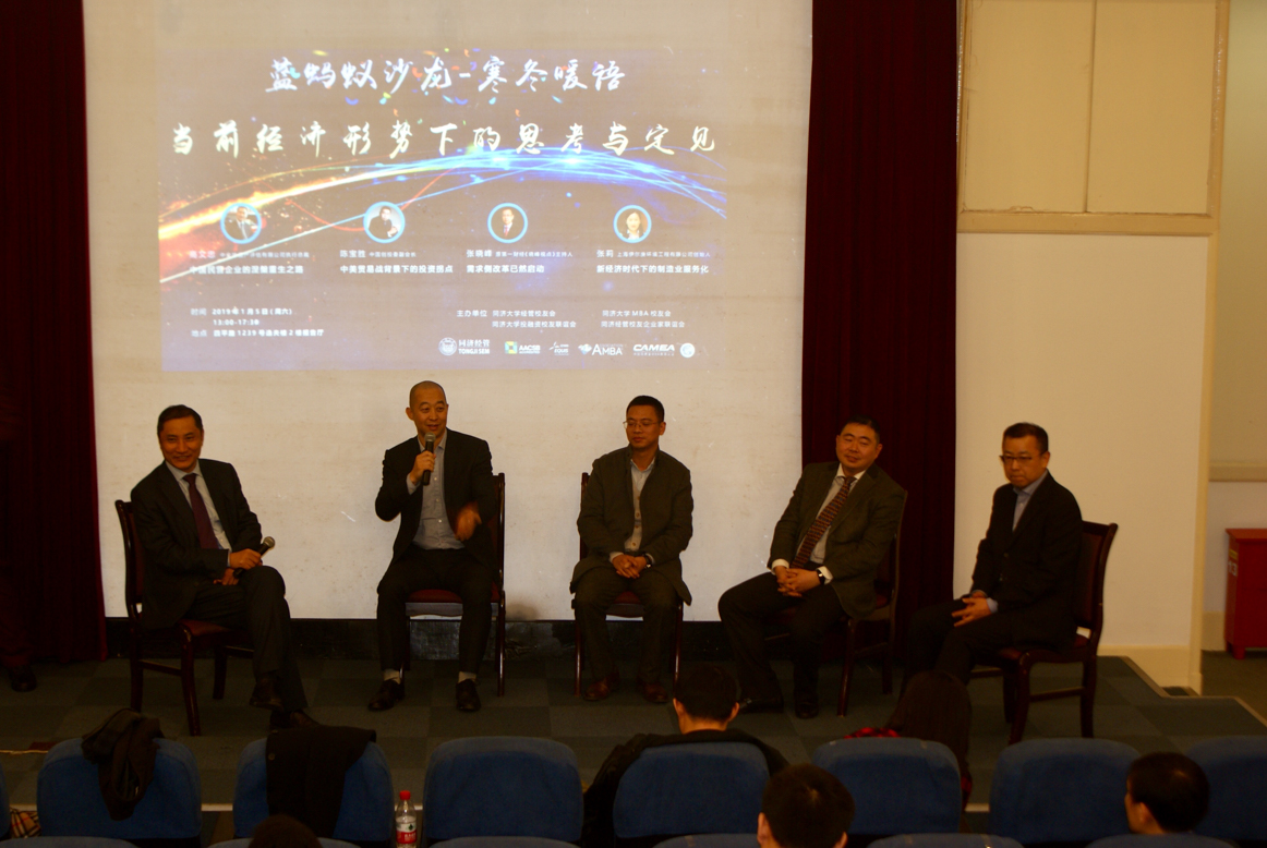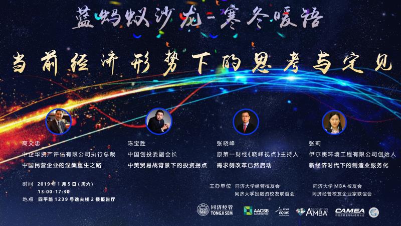 1月5日下午,由同濟(jì)經(jīng)管學(xué)院校友會、同濟(jì)MBA校友會、同濟(jì)投融資校友聯(lián)誼會、同濟(jì)經(jīng)管校友企業(yè)家聯(lián)誼會聯(lián)合組織舉辦,主題為“寒冬暖語:當(dāng)前經(jīng)濟(jì)形勢下的思考與定見——校友共論2019經(jīng)濟(jì)走向”的2018年藍(lán)螞蟻年度沙龍?jiān)谕瑵?jì)大學(xué)逸夫樓二樓報(bào)告廳隆重舉行。