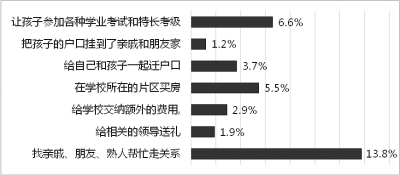 從2014年開始由中國人民大學(xué)中國調(diào)查與數(shù)據(jù)中心負(fù)責(zé)組織實(shí)施的中國教育追蹤調(diào)查(CEPS)通過對全國20個省、112所初中、近2萬名初中生及其家長的調(diào)查結(jié)果顯示,為了讓孩子在“小升初”過程中進(jìn)入所在的初中就讀,有13.8%的家長找親戚、朋友、熟人幫忙走關(guān)系,1.9%的家長給相關(guān)的領(lǐng)導(dǎo)送禮,2.9%的家長給學(xué)校交納額外的費(fèi)用,5.5%的家長在學(xué)校所在的片區(qū)買房,3.7%的家長給自己和孩子一起遷了戶口,1.2%的家長想辦法把孩子的戶口掛到了親戚和朋友家,6.6%的家長讓孩子參加各種學(xué)業(yè)考試和特長考級以爭取“特長生”的入學(xué)名額。統(tǒng)合計(jì)算,有26.8%的學(xué)生是至少借助了一種所列舉的擇校手段而進(jìn)入所在初中就讀的。這意味著,當(dāng)前我國的“小升初”過程中,有超過了四分之一的學(xué)生是擇校生。