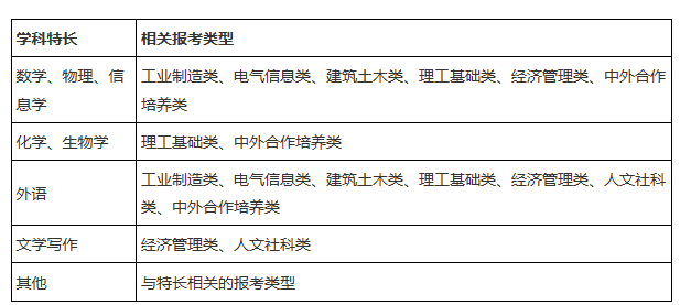 我校規(guī)定,各類學(xué)科特長相關(guān)的報(bào)考類型如下: