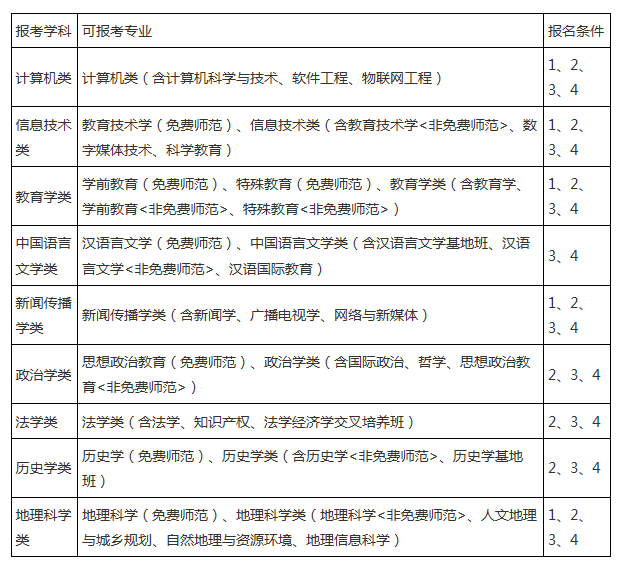 入圍合格考生只有在填報(bào)入圍學(xué)科相關(guān)專業(yè)才享受自主招生優(yōu)錄政策,各學(xué)科對(duì)應(yīng)專業(yè)及報(bào)名條件如下表所示:
