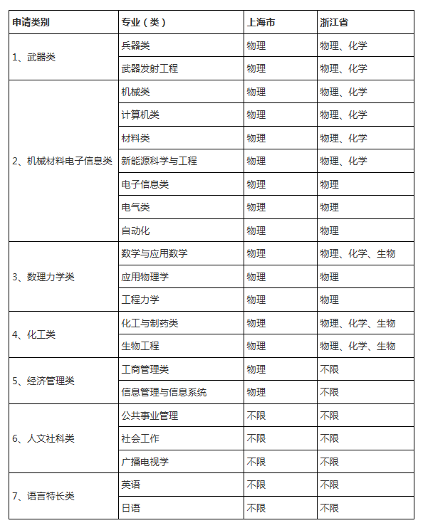 符合以上條件的考生根據(jù)自己的學(xué)科特長(zhǎng)、創(chuàng)新潛質(zhì),結(jié)合興趣愛好,申請(qǐng)以下類別中的一類,并具體到專業(yè)(類),不可兼報(bào),支撐材料必須與所申請(qǐng)類別學(xué)科特點(diǎn)相關(guān);獲得資格后專業(yè)志愿必須填報(bào)所申請(qǐng)的專業(yè)(類)。在實(shí)行高考改革的上海市、浙江省考生所申請(qǐng)專業(yè)(類)必須符合我校選考科目要求(見附錄),其他省(區(qū)、市)考生按照申請(qǐng)類別要求科類(文、理科)申請(qǐng)相應(yīng)專業(yè)(類)。具體類別如下: