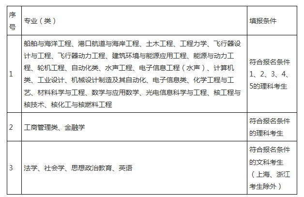 符合條件的考生根據(jù)專(zhuān)業(yè)填報(bào)條件,結(jié)合自己的學(xué)科特長(zhǎng)、創(chuàng)新潛質(zhì)、興趣愛(ài)好,可報(bào)2個(gè)專(zhuān)業(yè)(類(lèi))。招生專(zhuān)業(yè)(類(lèi))如下: