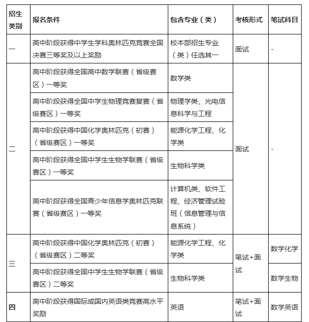 答:如考生在數(shù)學(xué)、物理、化學(xué)、生物學(xué)、信息學(xué)等學(xué)科成績(jī)特別突出并能提供相應(yīng)佐證材料可以申請(qǐng)報(bào)考我校自主招生類別六。