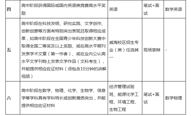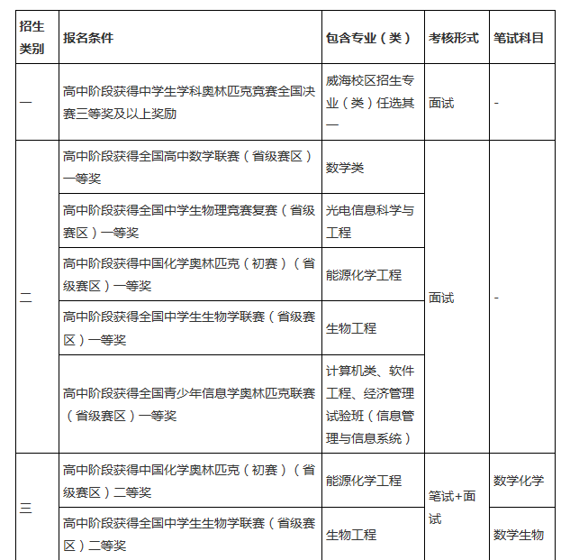 威海校區(qū)2017年自主招生類別、報(bào)名條件、包含專業(yè)(類)、考核形式及筆試科目見(jiàn)下表。