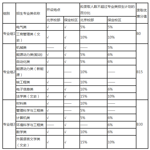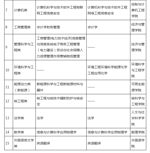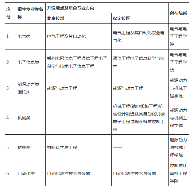 2017年我校實行大類招生,自主招生涉及15個專業(yè)類(其中:北京校部13個專業(yè)類、保定校區(qū)11個專業(yè)類)。各專業(yè)類所含專業(yè)方向、所屬院系如下: