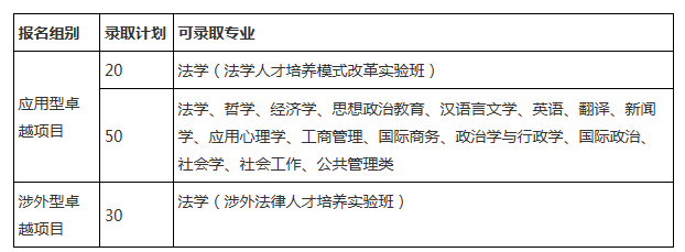 “卓越法治人才教育培養(yǎng)自主選拔計(jì)劃”分為兩個測試選拔項(xiàng)目:“應(yīng)用型復(fù)合型卓越法治人才教育培養(yǎng)選拔項(xiàng)目”(以下簡稱“應(yīng)用型卓越項(xiàng)目”)與“涉外卓越法治人才教育培養(yǎng)選拔項(xiàng)目”(以下簡稱“涉外型卓越項(xiàng)目”)。兩個測試選拔項(xiàng)目的錄取計(jì)劃和專業(yè)見下表: