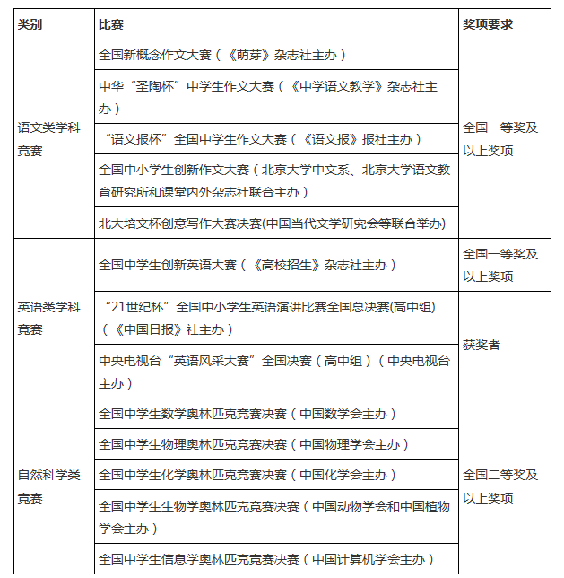 條件一分為語文類學(xué)科競賽獲獎、英語類學(xué)科競賽獲獎和自然科學(xué)類競賽獲獎三種。凡高中階段(應(yīng)屆生限2014年9月1日后所獲獎項(xiàng),往屆生限2013年9月1日后所獲獎項(xiàng))在此三類競賽中達(dá)到以下要求獎項(xiàng)者,均可報(bào)名。