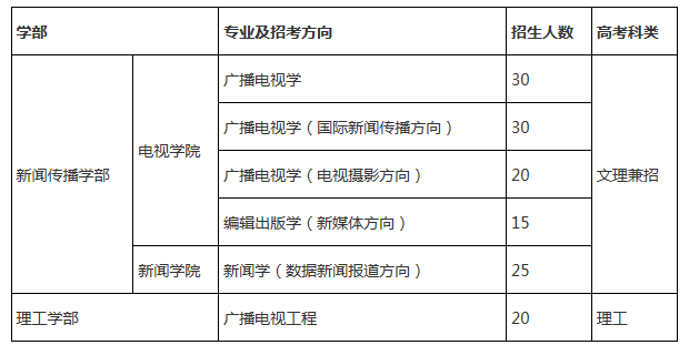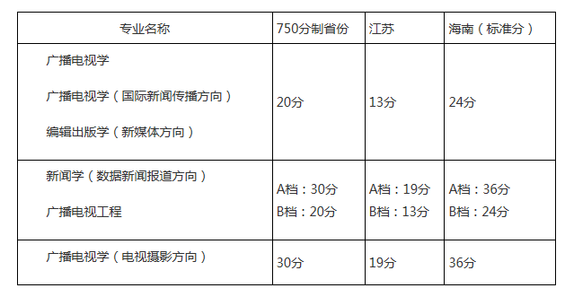 2.上海、浙江入選廣播電視學(xué)、廣播電視學(xué)(國(guó)際新聞傳播方向)、編輯出版學(xué)(新媒體方向)的考生,高考投檔成績(jī)達(dá)到上海、浙江確定的自主招生最低錄取控制參考線上30分及以上,按入選專業(yè)予以錄取;入選新聞學(xué)(數(shù)據(jù)新聞報(bào)道方向)、廣播電視工程專業(yè)A檔的考生,高考投檔成績(jī)達(dá)到上海、浙江確定的自主招生最低錄取控制參考線上20分及以上,B檔的考生,高考投檔成績(jī)達(dá)到上海、浙江確定的自主招生最低錄取控制參考線上30分及以上,按入選專業(yè)予以錄取;入選廣播電視學(xué)(電視攝影方向)的考生,高考投檔成績(jī)達(dá)到上海、浙江確定的自主招生最低錄取控制參考線上20分及以上,按入選專業(yè)予以錄取。