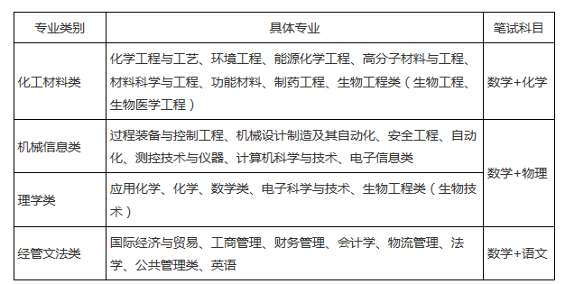 表1 北京化工大學(xué)2017年自主招生專業(yè)類別及其涵蓋招生專業(yè)和對應(yīng)筆試科目