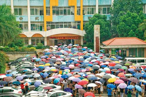 新學(xué)期開始了,校園又恢復(fù)了學(xué)生勤奮學(xué)習(xí)的朗朗讀書聲。然而,望子成龍的家長每天都關(guān)切牽掛著學(xué)生放學(xué)路途上的安全。圖為寶華路第五小學(xué),微微秋雨家長校園舉傘接新生放學(xué)一景。