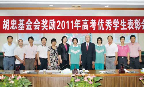 為鼓勵優(yōu)秀學子,胡忠基金會撥款3萬8千元獎勵我區(qū)今年高考理科前三名和文科第一名學生。他們分別是:理科第一名:黃震宇,總分646分,被中國科技大學錄;理科第二名:盧婉儀,總分644分,被南京大學錄。焕砜频谌罕R佩儀,總分640分,被中山大學錄;文科第一名:劉正琪,總分630分,被中國傳媒大學錄取。四名受表彰同學全部來自秀全中學,而盧婉儀和盧佩儀是雙胞胎姐妹。此外,高道興、楊媛等8位優(yōu)秀教師獲得胡忠基金會組織赴香港參觀學習的機會。
