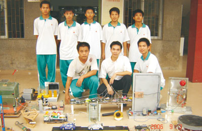 小發(fā)明家們與作品 花都區(qū)第一中學在推進素質(zhì)教育取得全面進步的基礎(chǔ)上,根據(jù)自身特點和地方資源優(yōu)勢,著眼于學校和學生的共同發(fā)展,確定特色學校創(chuàng)建目標,并按特色項目學校特色特色學校三個階段制訂創(chuàng)建規(guī)劃。緊緊圍繞“科技創(chuàng)新教育”,大力開展“科技活動節(jié)”、“研究性學習與社會實踐活動”、“科技小發(fā)明與小創(chuàng)作”三大主題活動,已逐步形成了以學生科技興趣小組活動和研究性學習為載體,以培養(yǎng)學生創(chuàng)新精神和實踐能力為目的的科技創(chuàng)新教育的辦學特色,走出了一條教學與科技創(chuàng)新相結(jié)合的辦學新路子。學校成立創(chuàng)建特色領(lǐng)導(dǎo)小組,加強管理,精心營造校園科技環(huán)境教育氛圍,先后建設(shè)一批科技教育景點和科技活動專用場室,如科技展覽室、科技實踐活動室、勞技制作室等,新建的科技教育景點有:150米科技宣傳長廊、氣象自動報測系統(tǒng)、太陽能熱水系統(tǒng)、風能發(fā)電校名顯示系統(tǒng)、聲控噴水系統(tǒng)、紅外線感應(yīng)智能沖水系統(tǒng)、紅外線感應(yīng)防盜系統(tǒng)、梯燈聲控開關(guān)系統(tǒng)等,同時在學校管理中使用具有一定科技含量的設(shè)施,如學生管理IC卡(考勤、圖書館、食堂一卡通用)、閉路電視監(jiān)控系統(tǒng)等,使校園的科技教育文化更鮮明、更濃郁、更生動。同時通過這些景點激發(fā)了學生的科技興趣,啟迪學生的科技意識。學校科技教育成績顯著,從2001學年至2008學年學校連續(xù)八年被評為“廣州市青少年科技教育先進集體”,先后被評為“廣州市綠色學校”、“廣州市青少年科技教育特色項目學校”、“花都區(qū)特色實驗學校”、“花都區(qū)知識產(chǎn)權(quán)教育試點學!。近三年來,學生研究的小發(fā)明,小創(chuàng)作達250件,學校組織學生參加各類科技競賽獲獎達239項,其中省級8項,市級85項,區(qū)級146項。 碩果累累 成績卓著 隨著教育改革的進程不斷深化,學校步入了全面發(fā)展的快車道,其發(fā)展之快,進步之大,前所未有。十年間,學校通過多種渠道和途徑籌集資金1200多萬元用于校園改造和設(shè)施建設(shè),使一所規(guī)模較小,設(shè)施簡陋,以破舊平房為主的鄉(xiāng)村學校發(fā)展成具有現(xiàn)代化氣息和園林式特點的新型學校。學校布局合理,規(guī)劃科學,寓美化、綠化、園林化和校園文化于一體。教學設(shè)備儀器完備齊全,校園網(wǎng)絡(luò)已投入教學使用,教學平臺已普及到班,各種專業(yè)場室一應(yīng)俱全,辦學條件已初步實現(xiàn)現(xiàn)代化。學校被評為花都區(qū)“文明校園”,廣州市教育技術(shù)裝備管理工作先進集體。