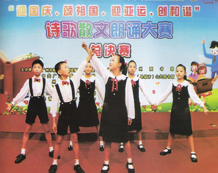 “迎國(guó)慶、送祖國(guó)、迎亞運(yùn)、創(chuàng)和諧”詩(shī)歌散文朗誦大賽 由于學(xué)校以行知教育為宗旨,以嶺南文化熏陶為品牌,以“賞識(shí)教育”為理念,用可持續(xù)的發(fā)展的理念來(lái)培養(yǎng)人塑造人,在培養(yǎng)學(xué)生的人格、提高綜合素質(zhì)上下功夫,學(xué)校教育教學(xué)工作成績(jī)碩果累累!近幾年來(lái),在各級(jí)競(jìng)賽、綜合評(píng)比中,都名列前茅,多次獲得花都區(qū)普教系統(tǒng)先進(jìn)單位一等獎(jiǎng)、教育教學(xué)質(zhì)量一等獎(jiǎng)。學(xué)校的“嶺南賞識(shí)教育”主題網(wǎng)站獲得全國(guó)中小學(xué)特色網(wǎng)站一等獎(jiǎng)。2009年6月鐘潔頻獲廣州市第三屆小學(xué)數(shù)學(xué)教師解題比賽一等獎(jiǎng)。2008年6月鐘潔頻、胡安華老師分別獲廣州市第二屆小學(xué)數(shù)學(xué)教師解題競(jìng)賽三等獎(jiǎng)。黎小梅老師的《讀書批注—行之有效的閱讀方式》刊登在《廣州教學(xué)研究》2007年第6期。鐘潔頻老師的論文《小學(xué)生英語(yǔ)寫作中的存在問題及改進(jìn)措施》刊登在《廣州教學(xué)研究》2009年第8期。時(shí)紅老師有數(shù)十篇文章發(fā)表在《英語(yǔ)周報(bào)》上。李志攀老師的科技論文《論機(jī)器人活動(dòng)教學(xué)方法》獲得廣州市三等獎(jiǎng)。在第二屆全國(guó)教師語(yǔ)言文字基本功大賽中,蔣湘玲、李志攀、歐陽(yáng)劍纓老師分別獲得一、 二、三等獎(jiǎng)。 2005年5月,學(xué)校首次派代表隊(duì)參加廣州市青少年機(jī)器人競(jìng)賽,獲得全市第三名,并代表廣州市參加廣東省的青少年機(jī)器人競(jìng)賽獲三等獎(jiǎng)。2006年11月在廣州市青少年機(jī)器人足球賽中,林泰鵬同學(xué)獲得亞軍。2007年5月劉稷樺獲廣東省首屆國(guó)學(xué)小博客一等獎(jiǎng)!2007年4月榮獲廣州市青少年機(jī)器人競(jìng)賽虛擬賽第一名、機(jī)器人足球賽二等獎(jiǎng),廣東省青少年機(jī)器人足球競(jìng)賽小學(xué)組三等獎(jiǎng)。在第九屆全國(guó)小學(xué)生英語(yǔ)競(jìng)賽中,李印心同學(xué)獲得五年級(jí)組一等獎(jiǎng),蒙佩怡同學(xué)獲得六年級(jí)組二等獎(jiǎng)。在第五屆小學(xué)“希望杯”全國(guó)數(shù)學(xué)邀請(qǐng)賽中肖宇翔獲二等獎(jiǎng),黃旭、丁志遠(yuǎn)、盧金海、鄺遠(yuǎn)宏、章瑞文獲三等獎(jiǎng)。2007年10月,林泰鵬同學(xué)參加廣州市機(jī)器人滅火競(jìng)賽獲三等獎(jiǎng)。2007年11月學(xué)校藝術(shù)團(tuán)參加廣州市決賽獲得一等獎(jiǎng)并被評(píng)為優(yōu)秀藝術(shù)團(tuán)。蒙佩怡獲廣州市第19屆小學(xué)英語(yǔ)競(jìng)賽二等獎(jiǎng)、廣州市小學(xué)六年級(jí)語(yǔ)文能力競(jìng)賽三等獎(jiǎng)。2008年12月李典典獲廣州市“讀文學(xué)名著,做書香少年”課外閱讀比賽三等獎(jiǎng)。2008年12月張竣峰、高崇宇獲廣州市中小學(xué)智能機(jī)器人滅火比賽二等獎(jiǎng)。2009年6月學(xué)校的舞蹈《花兒與少年》獲廣州市舞蹈節(jié)二等獎(jiǎng)。2009年9月詩(shī)朗誦《2008,中國(guó)加油!》獲廣州市二等獎(jiǎng)。