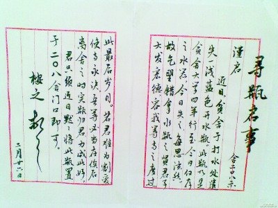 昨日(28日),記者在該校當代學(xué)生公寓開水房看到,兩頁用行楷毛筆字手書的尋瓶啟事貼在墻上,字體漂亮,措辭古雅,還是用的豎式老信紙,儼然參賽的書法作品。文中寫道:“近日,貧舍于打水處遺失一淺藍色開水瓶。此瓶乃是貧舍大學(xué)四年行至今日僅存之水器,今日失之,每思泫然。故乞望錯拿水瓶之賢君子大發(fā)宏德,容我等與之度過此最后歲月。若君難為割愛,使與永訣,吾等必當在俟后離舍之時完瓶歸君,力成此好。君只須近日默默將此瓶置于二○八舍門口即可……”