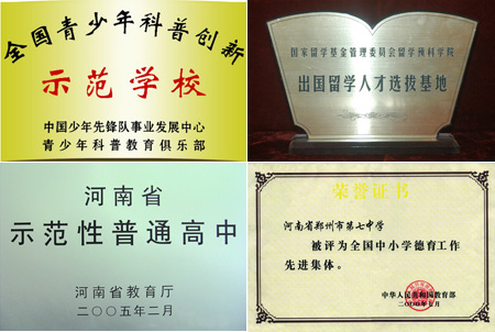 學(xué)校連年被評(píng)為鄭州市高、初中教育教學(xué)先進(jìn)單位、教科研先進(jìn)單位。并獲得“全國(guó)中小學(xué)德育先進(jìn)單位”、“全國(guó)青少年科普創(chuàng)新示范學(xué)!、“全國(guó)優(yōu)秀家長(zhǎng)學(xué)!薄ⅰ叭珖(guó)中小學(xué)教育科研聯(lián)合體常務(wù)理事學(xué)!薄ⅰ氨本2008奧林匹克教育示范學(xué)!薄ⅰ皣(guó)家級(jí)體育傳統(tǒng)項(xiàng)目學(xué)!薄ⅰ爸袊(guó)校園文化建設(shè)百佳示范學(xué)!钡葮s譽(yù)稱號(hào)。