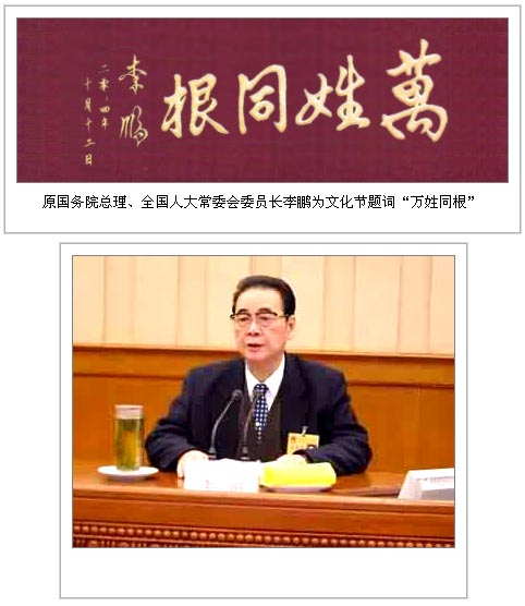 原國務(wù)院總理、全國人大常委會(huì)委員長李鵬為文化節(jié)題詞“萬姓同根”
