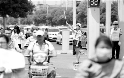 6月28日,“小交警”在民警的指導(dǎo)下上崗體驗(yàn)指揮交通。