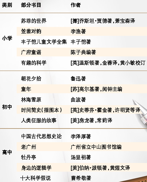 還在為該讓孩子讀什么課外書發(fā)愁么?廣州市教育局給出了權威推薦!昨日,廣州市教育局舉行了2015年廣州市中小學經(jīng)典閱讀推薦書目發(fā)布會,公布了小學、初中、高中階段推薦書目共計300本!斑@300本推薦書目并不算多,50年之后見成效。”廣州大學中文系教授曾大興說。