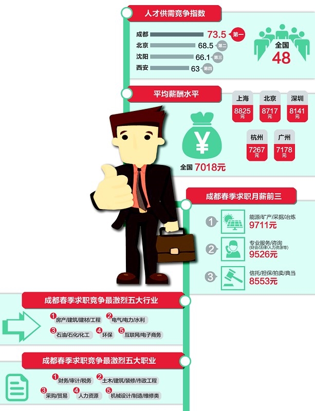 “金三銀四”求職高峰期,成都哪些行業(yè)競爭最為激烈?成都薪水較高的行業(yè)有哪些?近日,某招聘網(wǎng)站發(fā)布的2016年春季中國雇主需求與白領(lǐng)人才供給報告顯示,白領(lǐng)春季跳槽平均48人搶一個崗位,競爭壓力同比翻倍,成都的競爭指數(shù)依然在該招聘網(wǎng)站監(jiān)測的32個主要城市中排名第一。