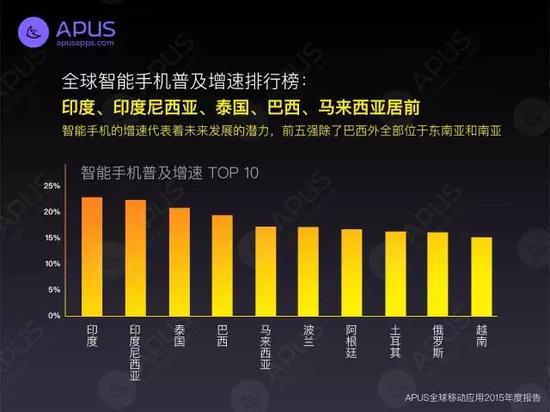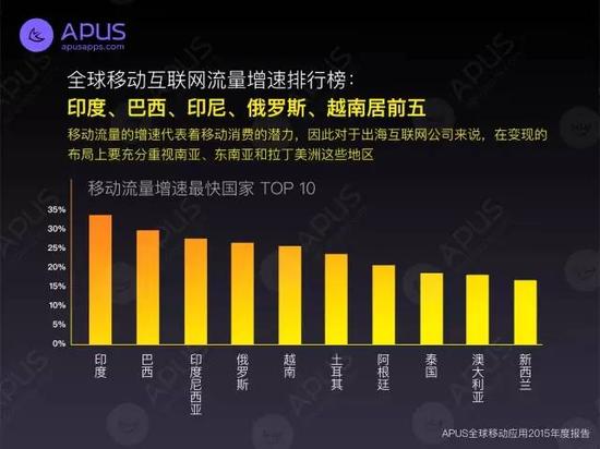 近日,移動互聯(lián)網(wǎng)公司APUS發(fā)布全球移動應用市場2015年度報告,數(shù)據(jù)顯示南亞、東南亞地區(qū)智能手機市場呈現(xiàn)爆炸式增長,且互聯(lián)網(wǎng)流量增速顯著。此外全球APP類型喜好度排行顯示,中國人愛好買買買,新加坡人愛社交,美國人喜歡游戲,而印度則偏好工具類。