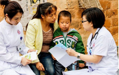 ▲賀醫(yī)生(右一)在湖南湘潭湘鄉(xiāng)市梅橋鄉(xiāng)為貧困白血病患兒看病(資料照片)! ⌒氯A社發(fā)