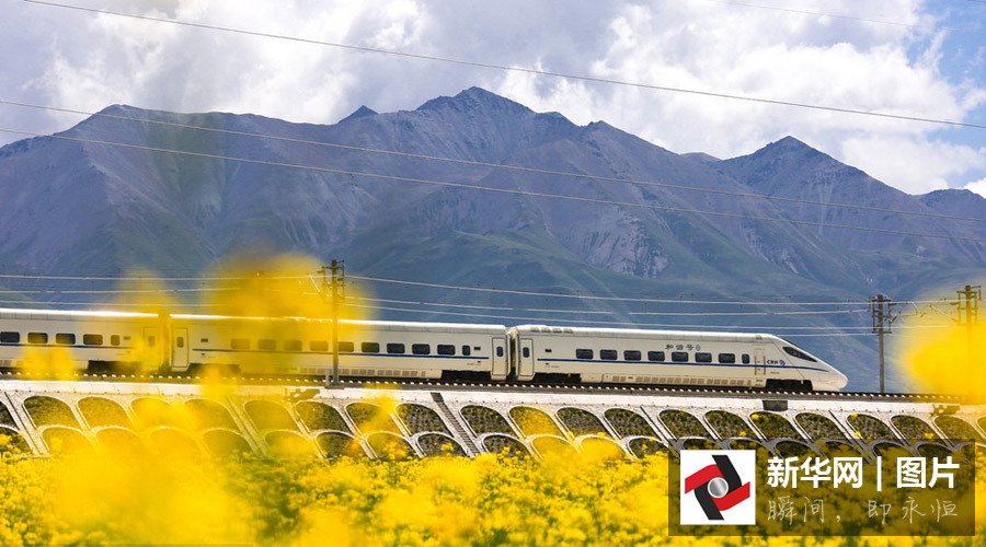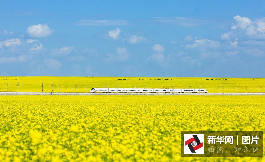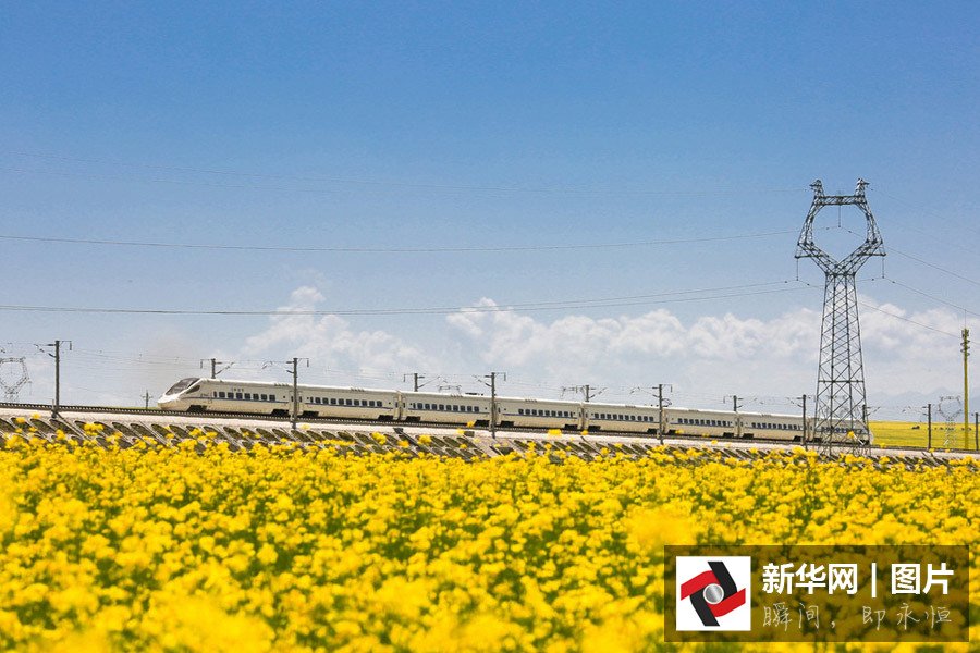 進入7月,位于青海省門源回族自治縣的油菜花競相綻放,形成高原地區(qū)壯觀的“百里油菜花海”美景,蘭新高鐵列車穿梭在其中,宛如游在畫中,被人們譽為西北最美高鐵線。