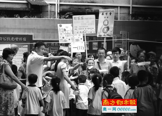 記者昨天來到培正小學(xué)一帶看到,托管班成行成市,三步一托管,五步一機(jī)構(gòu),無不打著招攬學(xué)生的牌子。中午放學(xué)時(shí)分,更是數(shù)家托管機(jī)構(gòu)工作人員一邊派招生傳單,一邊接孩子。有些懵懂的孩子差點(diǎn)站錯(cuò)隊(duì),跑到隔壁家托管蹭飯去了。