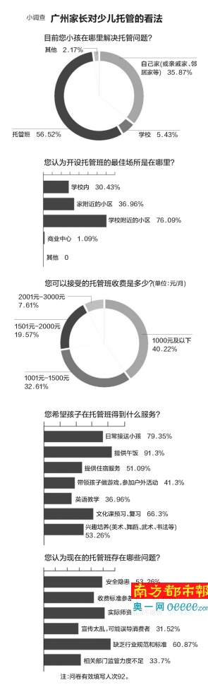 全市有著正式牌照的托管機(jī)構(gòu)有多少家?根據(jù)2014年廣州市工商局給出的數(shù)據(jù)是13家,不過,這13家中大部分因不符合相關(guān)許可要求,經(jīng)營(yíng)范圍并不包括寄膳、寄宿和交通運(yùn)輸,僅“為家長(zhǎng)接送學(xué)生并托管”。