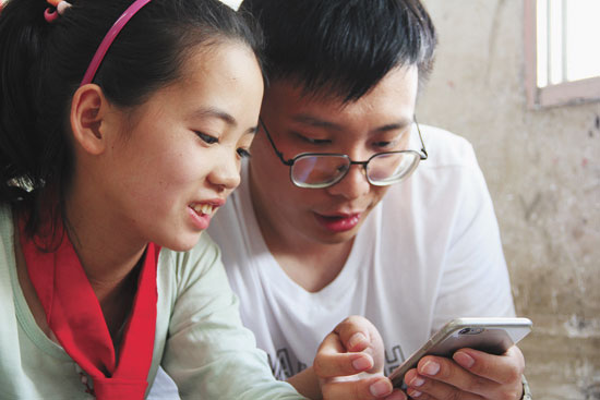 在坡峨小學(xué),大學(xué)生記者用手機(jī)向當(dāng)?shù)貙W(xué)生介紹外面的世界 山東大學(xué) 魏廷義