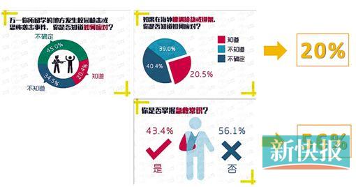 然而,在發(fā)生校園槍擊、恐怖襲擊事件,或遭遇搶劫、綁架時(shí),明確知道該如何應(yīng)對的留學(xué)生只有20%左右,34.5%的留學(xué)生表示當(dāng)遇到安全威脅時(shí)不知道如何應(yīng)對,56%的學(xué)生表示并沒有掌握急救常識?梢娏魧W(xué)生的安全意識相對淡薄,安全技能缺乏。