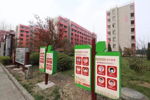 不僅主色彩變了,每個(gè)樓都有被起了一個(gè)勵志的名字:“卓遠(yuǎn)樓”、“行嘉樓”、“立身樓”、“明心樓”……在每棟樓上,還有非常醒目的紅色標(biāo)語。