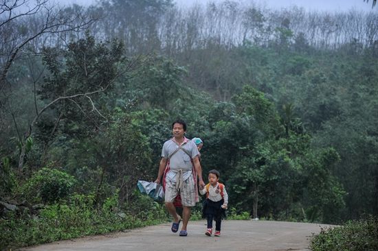 3月8日清晨,一位苗族家長(zhǎng)送孩子上學(xué)。
