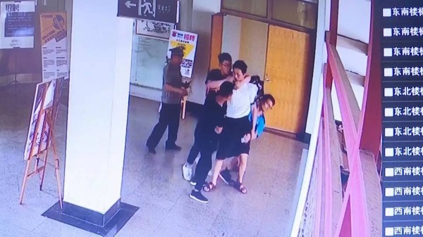 雙手熊抱,下腿橫掃!動作干凈利索、一氣呵成!倒、倒!看你倒不倒!短短幾秒鐘,身穿藍(lán)衣服的高老師和另外三名同學(xué)一起,就把白衣男子摁倒在地!哼哼…小樣!看你再往哪里跑!