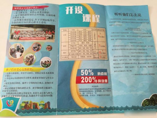 7月5日,剛結束期末考試,按照“陜西愛心支教聯(lián)盟”的安排,張娜和同伴來到了漢中市南鄭縣紅廟鎮(zhèn)的愛心支教點。“陜西愛心支教聯(lián)盟”要求7月15日正式開課,開課前首先要做招生工作。張娜和同伴一起來到紅廟鎮(zhèn)小學門口,發(fā)放宣傳單,向學生和家長介紹將要開展的愛心支教活動。在這個過程中,她發(fā)現(xiàn),“陜西愛心支教聯(lián)盟”提供的宣傳單上承諾“所有課程全部免費,只收取一定的課時成本費用,開課之后不再收取任何費用”,同時還明確,為保證教學質量,每個班限招20人,招滿為止。張娜發(fā)現(xiàn),每個報名的學生要交6元/課時的課時費。