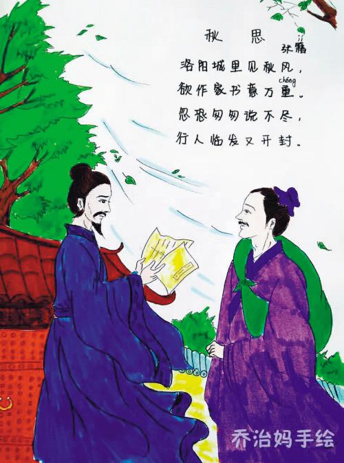 很多古詩都沒有有趣的解釋和圖片說明,為何不能在學(xué)習(xí)古詩的時(shí)候畫出詩文描述的場景呢?喬治媽開始為《秋思》配圖。喬治媽畫作中,抓住了秋風(fēng)這個(gè)重點(diǎn),畫作中秋風(fēng)不但吹搖了樹枝、吹落了葉片,更吹蕩起詩人的衣袖。畫中藍(lán)衣是詩人張籍,紫衣身負(fù)包裹的就是將要回鄉(xiāng)的友人。
