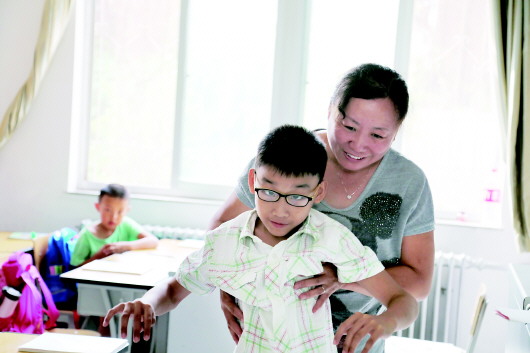 在媽媽的照顧下,于卓群的課間活動已不成問題,但也有尷尬的時(shí)候。比如上廁所,剛開始,王莉背著兒子到男廁所,同學(xué)們見進(jìn)來一個(gè)女的,都一哄而散。后來,她又試著將兒子背到女廁所,但兒子死活都不干。最終,王莉只有等到大家都上課了,才帶著兒子去上廁所。