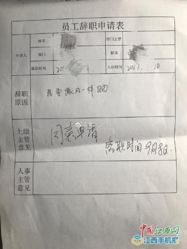 網(wǎng)友“露寶_1993”發(fā)微博:“我家客服離職,好有個(gè)性!辈⑴溆幸粡垺半x職員工申請(qǐng)表”,這位辭職客服在申請(qǐng)表上辭職原因一欄寫著:“我要像風(fēng)一樣自由”。