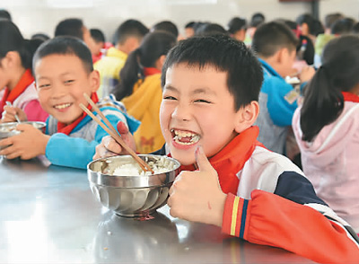 四川省三臺(tái)縣新生鎮(zhèn)小學(xué)學(xué)生吃午餐。