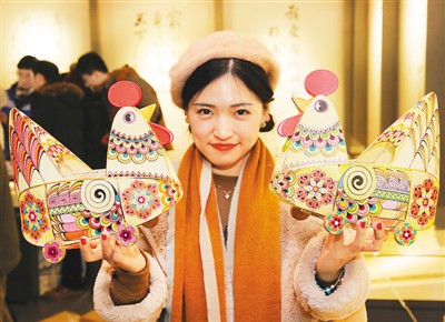 圖為香港學(xué)生在南通歷史文化展示中心展示南通燈彩生肖雞作品。
