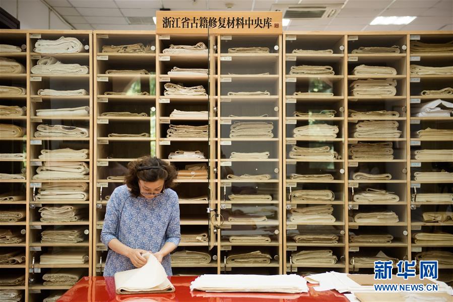 5月23日,閻靜書從浙江省古籍修復(fù)材料中央庫取出合適的紙張,準(zhǔn)備進(jìn)行修復(fù)工作。