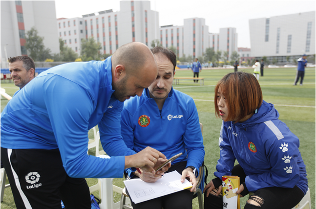 2019年全國青少年校園足球夏令營開營,外教在交流。